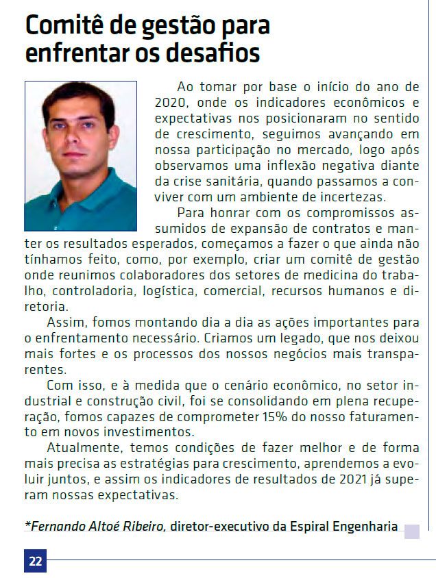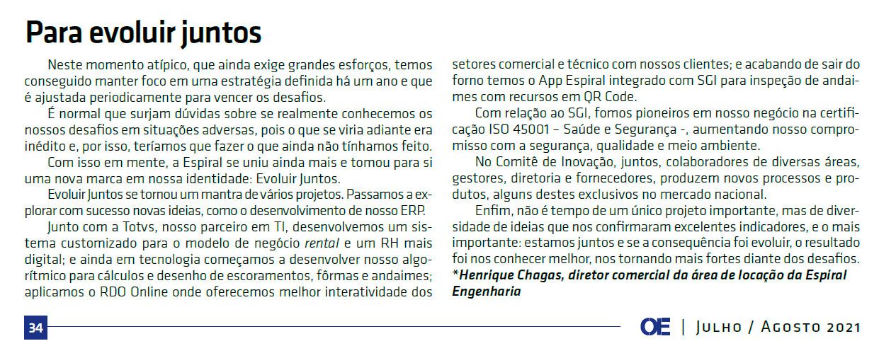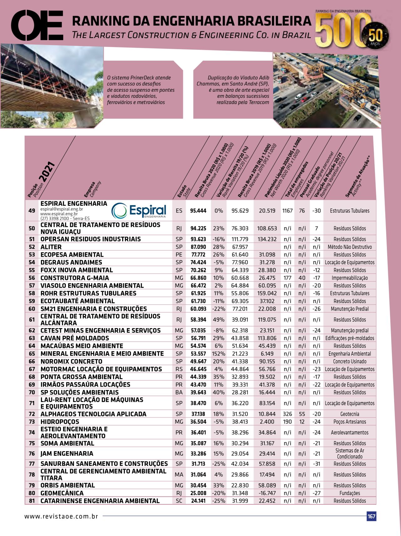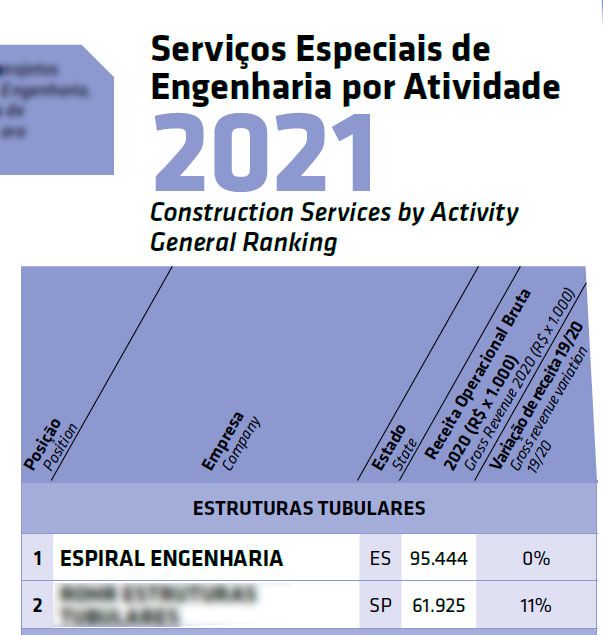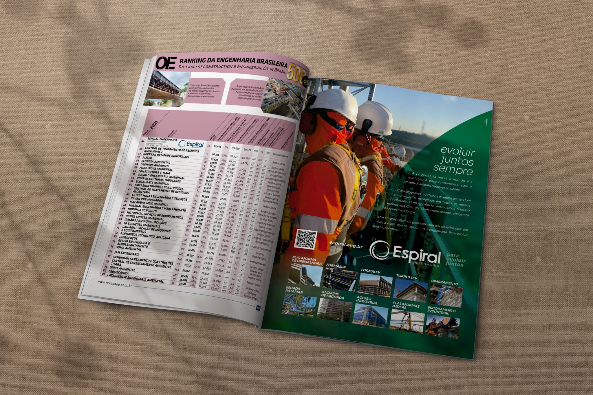 A Espiral Engenharia marca presença em mais uma edição da 500 Grandes da Construção – Ranking da Engenharia Brasileira, na qual manteve sua colocação em 1º lugar na especialidade de Estruturas Tubulares, e está em 49º lugar no Ranking Nacional. A edição do Ranking também com textos do diretor executivo Fernando Altoé e diretor comercial da locação Henrique Chagas.