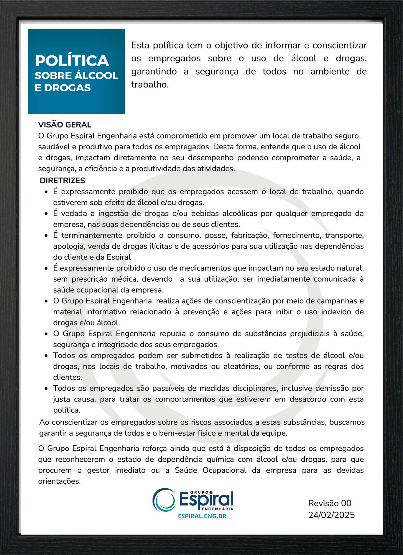 Esta política tem o objetivo de reafirmar o compromisso do Grupo Espiral Engenharia