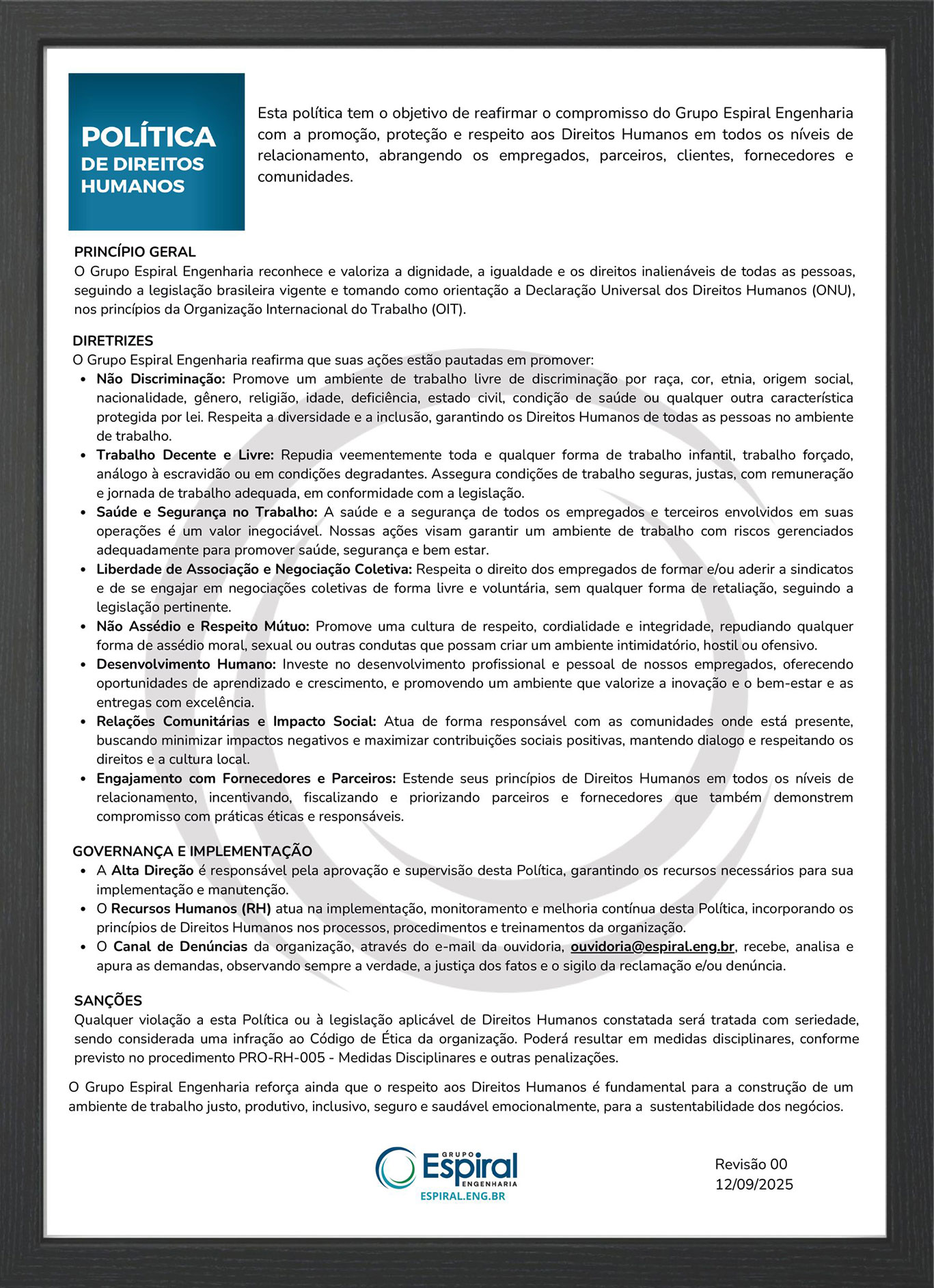 O Grupo Espiral Engenharia reforça ainda que o respeito aos Direitos Humanos é fundamental para a construção de um